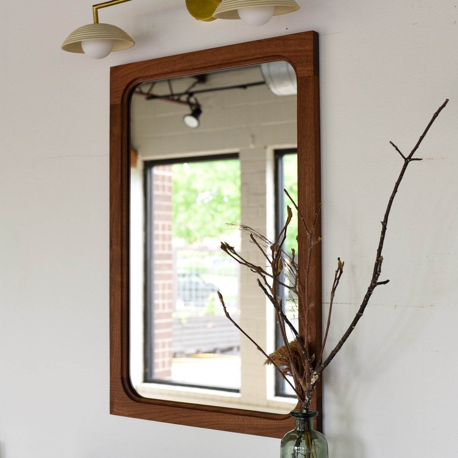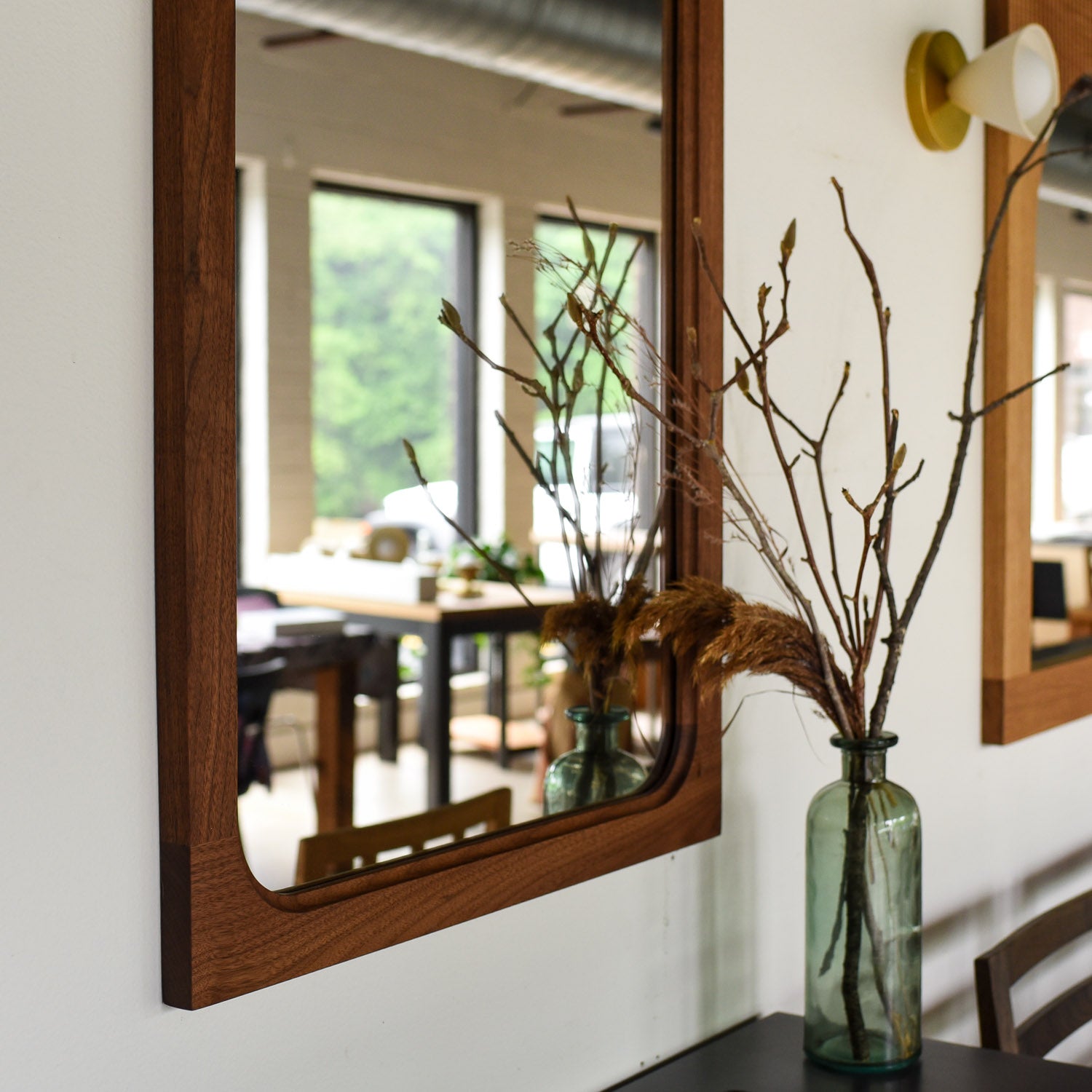 Exclusively designed for What We Make by Han Studio, the Frances Solid Wood Wall Mirror takes its cues from vintage French window panes, reimagined with a bold, modern silhouette. Handcrafted in Pittsburgh from sustainably sourced American hardwood, each mirror is meticulously shaped and finished to highlight the natural beauty of the wood. Perfect as a bathroom vanity mirror, entryway mirror, or refined architectural accent over a dresser, mantel, or sideboard, the Frances brings depth, warmth, and timeless craftsmanship to any space
